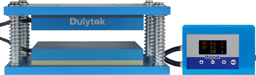 The plate kit consists of caged 4 by 9 anodized aluminum insulated plates and a temperature/timer control module with magnetic feet for easy mounting anywhere on your press.