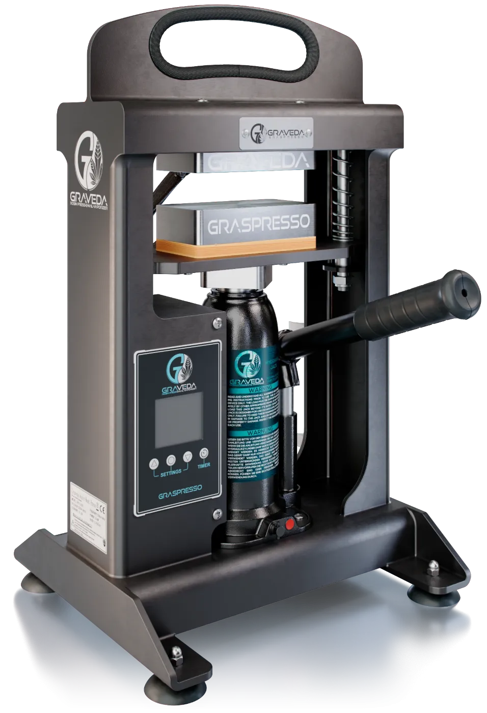 The Graspresso GP6010 Rosin Press from Graveda is designed in Germany. Practical, robust, durable and solid materials have been used in this occasion. In addition, it has a 10 ton hydraulic cylinder. The compression force of the cylinder can reach up to 9.14 tons of pressure according to the results of the tests that were carried out by our specialists before the product release.