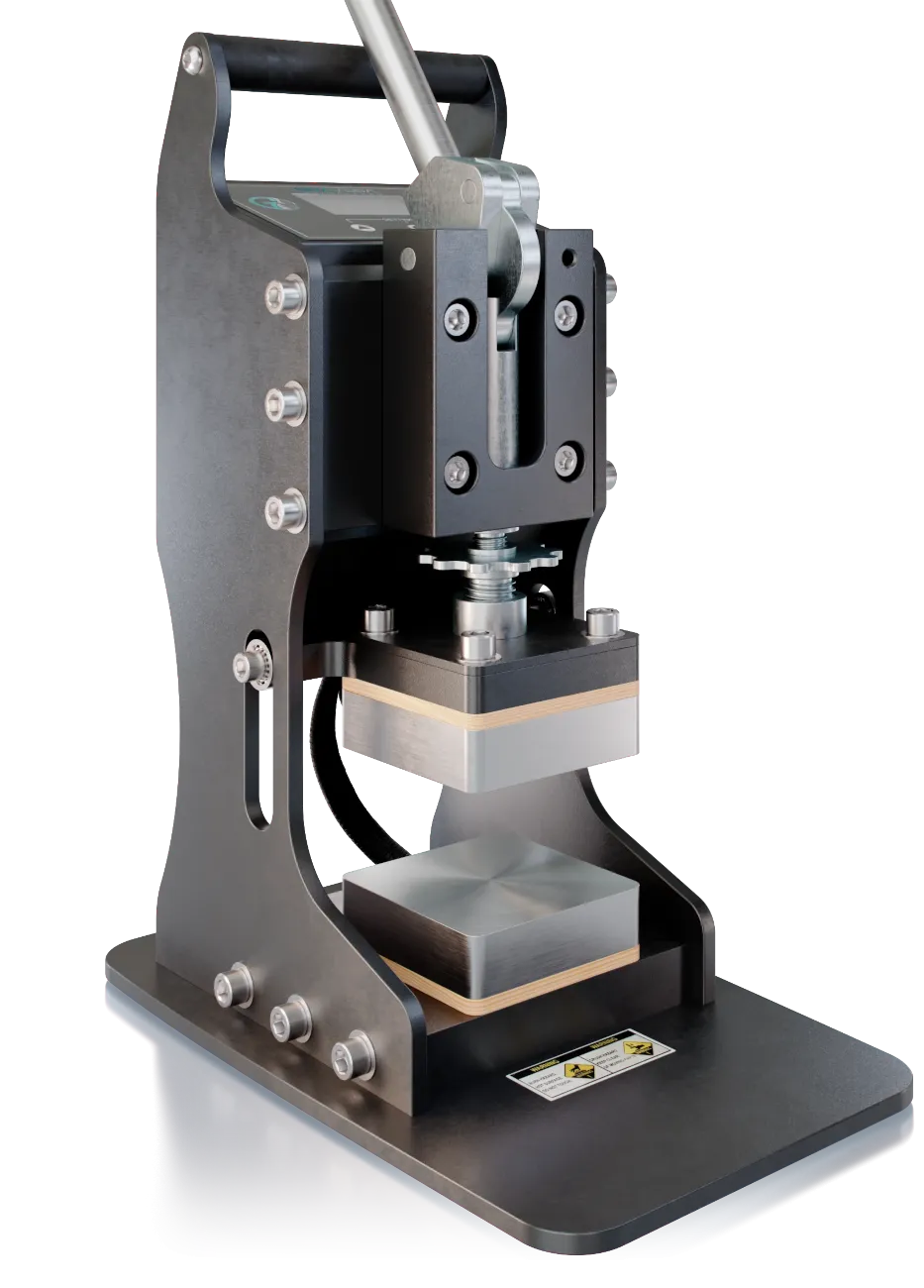 The solid aluminum plate, measuring 7.5 cm x 7.5 cm, ensures precise and even pressure distribution. Additional stability and precision are provided by integrated guide rails and table mounting.