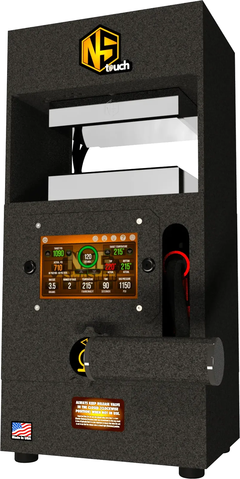 The NugSmasher® TOUCH Rosin Extraction System allows ALL users to become an Expert at day one with NugSmasher’s precise methodology specific bag sizes and accurate DIGITAL pressure reading giving the user consistent results every time. Extracts up to 28 Grams of flower each smash. When it comes to the Touch Model harnessing the utmost control and advanced preset smash parameters has never been so within reach! The Touch model is designed to take all the guesswork out of your press and provide an absolute point of reliability met with the incredible yields that you can come to expect from the NugSmasher lineup. In addition refining your own material and creating your own isolates with the Touch becomes increasingly easier as you take advantage of the precise digital controls portrayed on your screen.