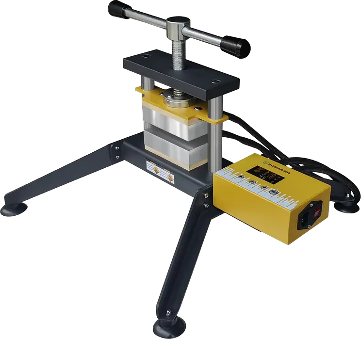 Rosineer GRIP manual rosin press is very easy to set up and use when pressing at home. Just enter your desired settings into the compact two-channel temperature and time controller, wait for the 3" x 5" insulated plates to finish heating, and rotate the twist handle to apply significant pressure of up to 5000 - 5500 lbs. When done, rotate the handle counterclockwise and remove your pressed material.