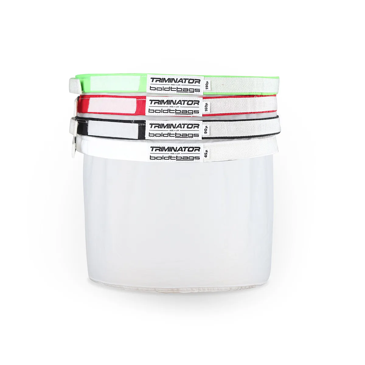 Triminator/Boldtbags Lock-Top Bags can be easily attached to the Fixed Wash Bag Rings or the Stackable Wash Bag Spacers on the Maker™ Collection Vessel or onto Rubbermade/Brute barrels and are kept tightly in place with velcro around the rings/spacers.