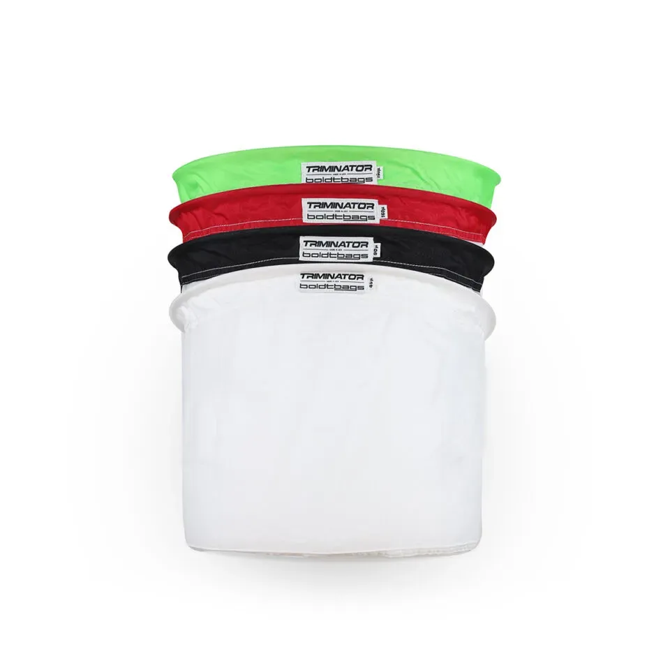 Triminator/Boldtbags Solid-Frame Bags can be easily attached to the Fixed Wash Bag Rings or the Stackable Wash Bag Spacers on the Maker™ Collection Vessel or onto Rubbermade/Brute barrels and are kept tightly in place with velcro around the rings/spacers.